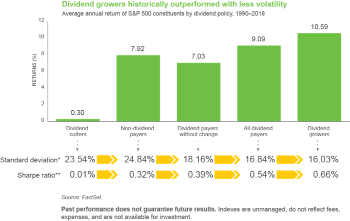 But don’t take my word for it. Check out the evidence, which shows companies with a consistent history of rising dividends have not only generated superior returns over the long term, but they have done so with less risk (as measured by standard deviation*), compared to stocks that pay no dividends at all or even those that simply keep dividends unchanged.