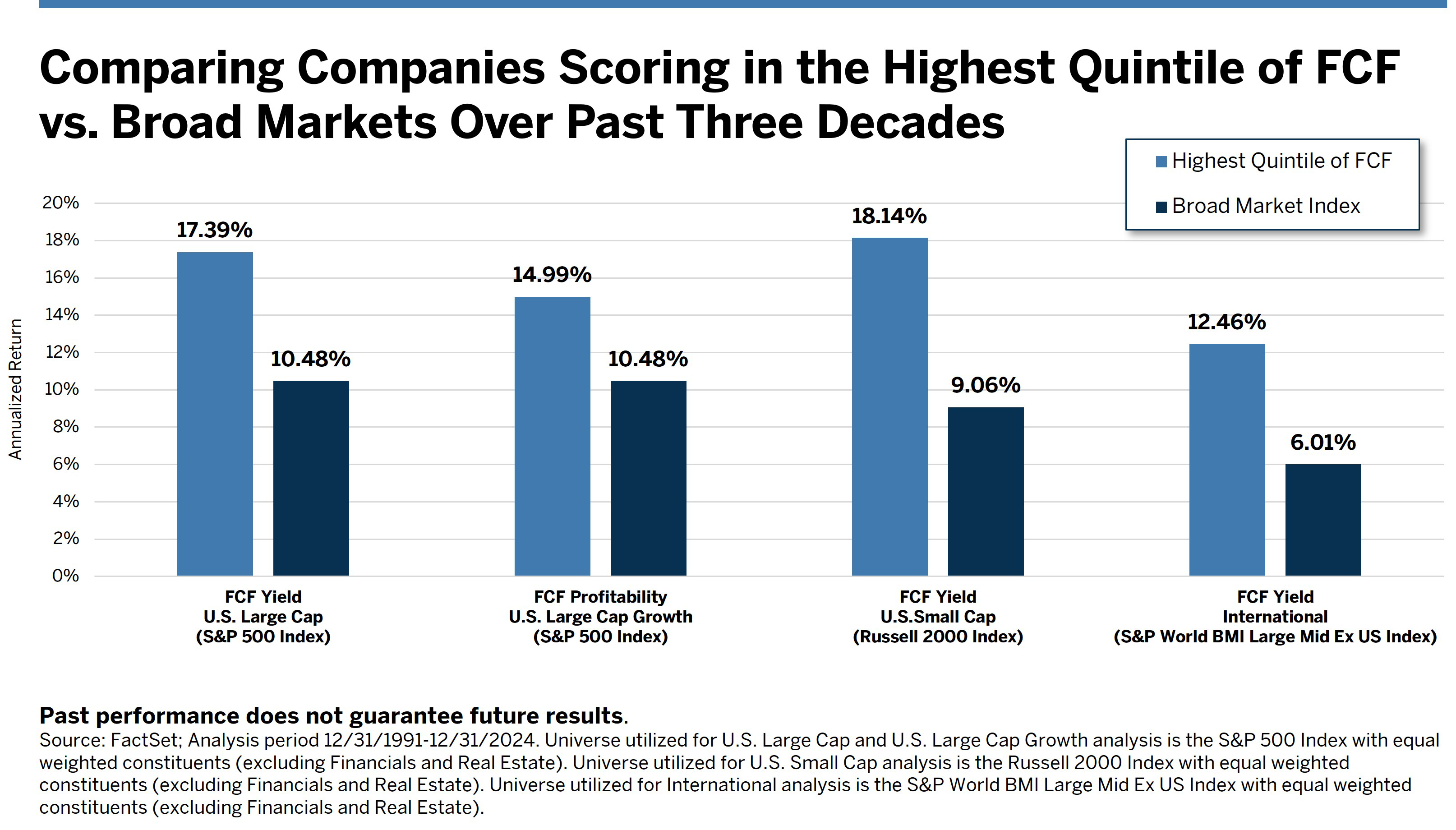 When it comes to using FCF to help build an equities portfolio, we want to reiterate that we believe there’s no need to limit it to large-cap domestic equities. Plus, if market leadership continues to broaden out and move beyond a narrow cohort of mega-cap stocks, we think a diversified FCF approach could be especially effective. Thus, if historic and future FCF is a harbinger of company health and share price performance, why not consider applying it broadly in today’s environment?