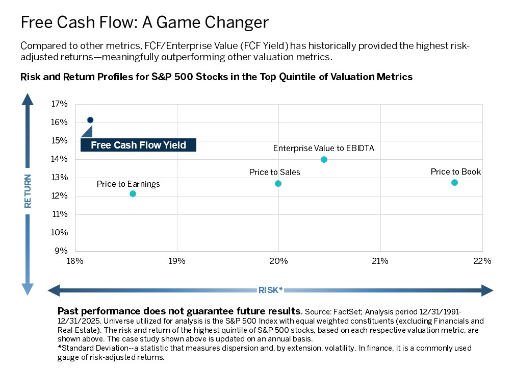 We believe free cash flow yield can be both a harbinger of long-term health and future potential performance (based on our research), as well as an indicator of risk-adjusted potential, as illustrated by the graph below. The key takeaway is that FCF yield has demonstrated better risk-adjusted returns when compared to other popular measures of valuation.